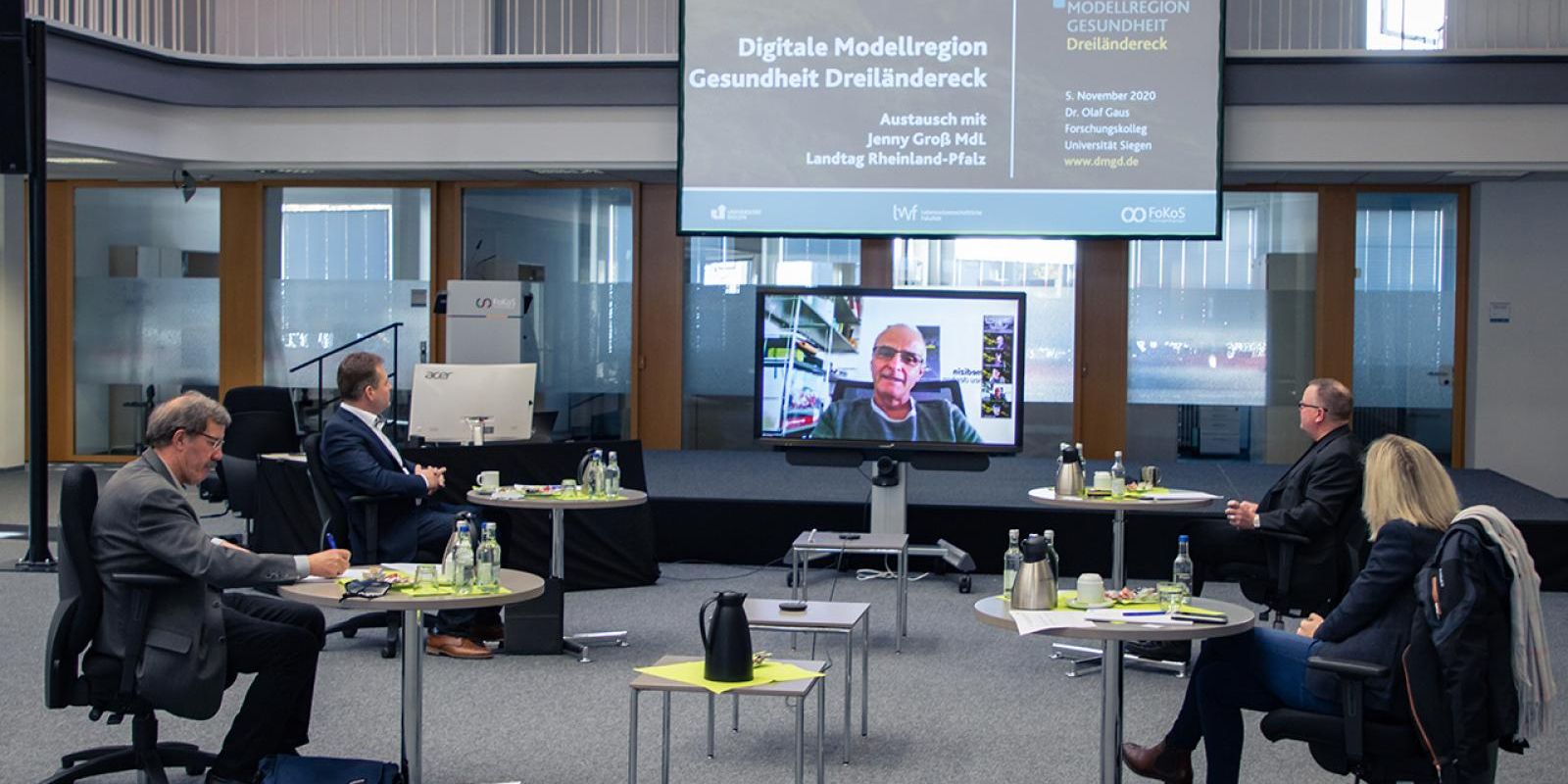 Diskutierten digitale Versorgungskonzepte für den Westerwaldkreis im Forschungskolleg der Universität Siegen: Gerrit Müller (Bürgermeister Verbandsgemeinde Rennerod), Karl-Heinz Boll (Kreistagsmitglied Westerwaldkreis), Jenny Groß (MdL RLP) und Dr. Olaf Gaus (Geschäftsführer FoKoS) v. l. n. r., virtuell hinzugeschaltet Prof. Dr. Christoph Strünck, Prof. Dr. med. Veit Braun und Prof. Dr. Rainer Brück (Dekane und Prodekane der Lebenswissenschaftlichen Fakultät)