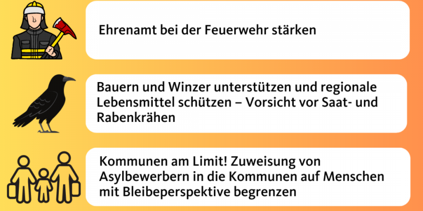 Wir legen Vorschläge vor, wie wir unsere Freiwilligen Feuerwehren und das ehrenamtliche Engagement stärken und attraktiver machen wollen. Wir haben die Bauern und Winzer im Blick und die regionalen Lebensmittel, die sie für uns produzieren.