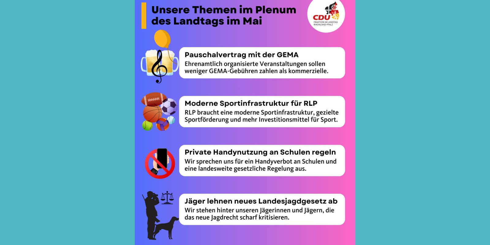 In der aktuellen Sitzungsrunde des rheinland-pfälzischen Landtags hat sich die CDU-Landtagsfraktion unter anderem mit drei zentralen Themen beschäftigt, die das gesellschaftliche Miteinander in Rheinland-Pfalz direkt betreffen: die Unterstützung des Ehrenamts durch einen GEMA-Pauschalvertrag, die dringend notwendige Verbesserung der Sportinfrastruktur sowie ein Gesetzesvorstoß zur Regelung der Handynutzung an Schulen.