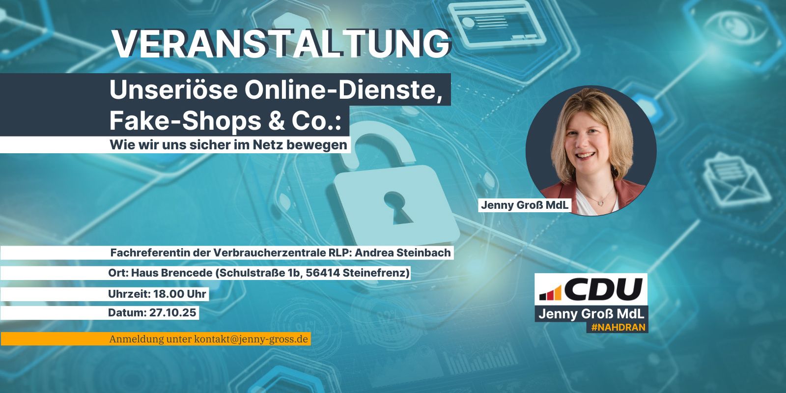 Immer häufiger werden Verbraucherinnen und Verbraucher Opfer von betrügerischen Online-Angeboten, Phishing-Mails oder dubiosen Fake-Shops. Um für diese Gefahren zu sensibilisieren, lädt die Landtagsabgeordnete Jenny Groß (CDU) gemeinsam mit der Verbraucherzentrale Rheinland-Pfalz zu einer Informationsveranstaltung ein: