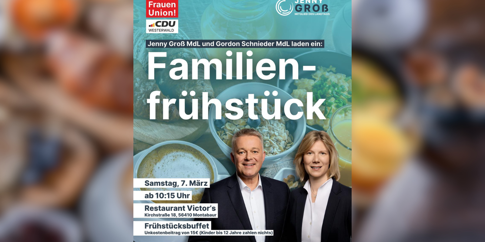 Montabaur. Die Frauen Union CDU Westerwald lädt gemeinsam mit der Landtagsabgeordneten Jenny Groß am Samstag, 7. März, zu einem Familienfrühstück nach Montabaur ein. Beginn der Veranstaltung ist um 10:15 Uhr im Restaurant Victor’s, Kirchstraße 18.