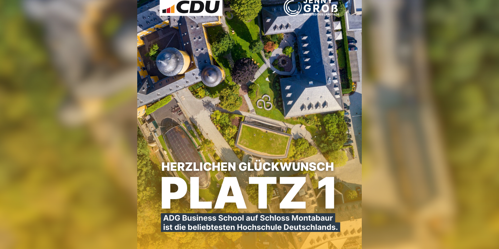 Studieren mit Weitblick: Die ADG Business School auf dem Campus Schloss Montabaur ist erneut für ihr exzellentes berufsintegriertes Studienangebot prämiert worden. Jenny Groß MdL, bildungspolitische Sprecherin der CDU-Landtagsfraktion, und der Geschäftsführer der ADG Business School, Dr. Christoph Stumm, sind sich einig über die Bedeutung dieses Erfolgs. „Montabaur ist ein ausgezeichneter Ort für akademische Bildung mit deutschlandweitem Ruf! Ich gratuliere der ADG Business School zu ihren herausragenden Auszeichnungen von StudyCheck“, so Jenny Groß.