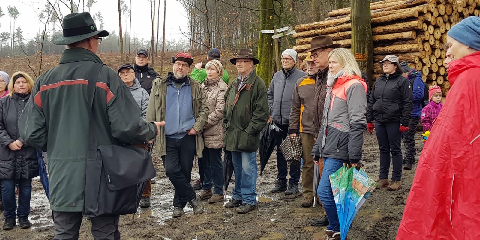 Trotz strömenden Regens und damit verbunden nasser Kälte trotzen rund 50 Gäste dem Wetter und wagten einen Informationsrundgang durch den Wald: Tiefe Furchen und meterweise abgelagertes Fichtenholz auf den Waldwegen ließen erahnen, wie geschädigt der Wald ist: Ganze Waldbereiche sind verschwunden. Die Spuren, die der Klimawandel, die beiden Borkenkäferarten Buchdrucker und Kupferstecher, hinterlassen haben, sind dramatisch.