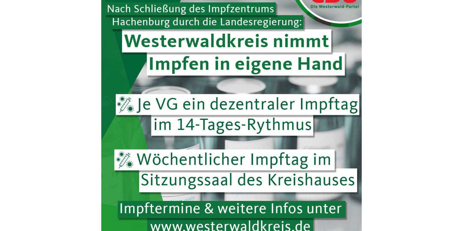 „Das Land lässt uns im Kreis in Sachen Eröffnung des Impfzentrums weiter im Regen stehen! Doch wir Westerwälder lassen uns nicht unterkriegen und ich bin meinem Kreis sehr dankbar, dass neben dem wöchentlichen Impftag im Kreishaus (Anmeldung notwendig) auch je Verbandsgemeinde ein dezentraler Impftag im zwei Wochen Turnus kommt, um Impfungen durchzuführen“, so Jenny Groß MdL.