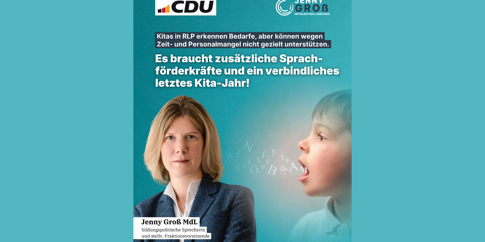 „Wenn Kitas Bedarfe kennen, aber wegen Zeit- und Personalmangel nicht gezielt unterstützen können, ist das kein Erkenntnisproblem, sondern ein Strukturproblem“, erklärt Jenny Groß, bildungspolitische Sprecherin der CDU-Landtagsfraktion Rheinland-Pfalz.
